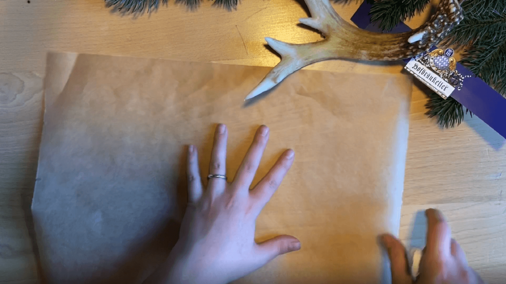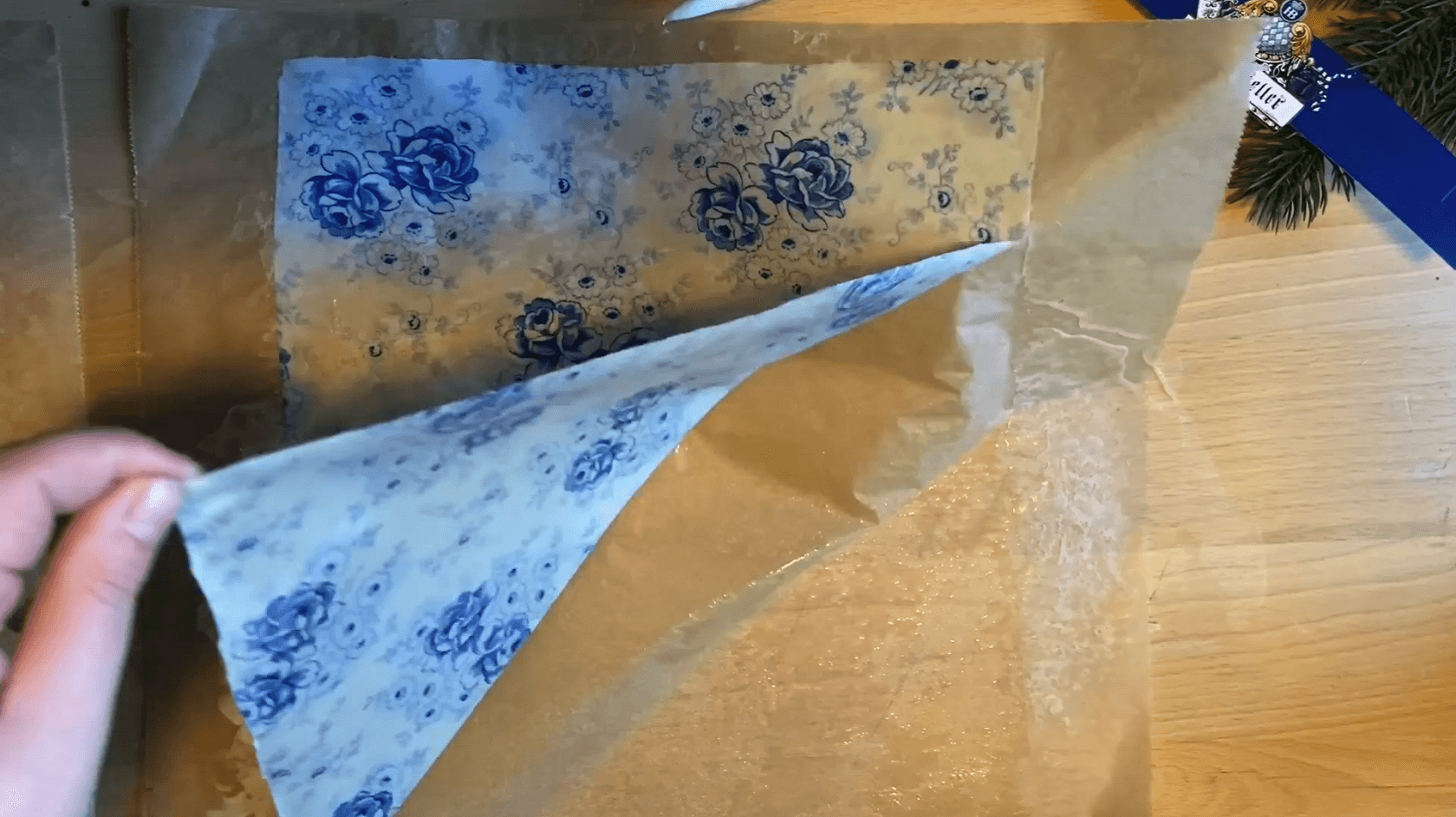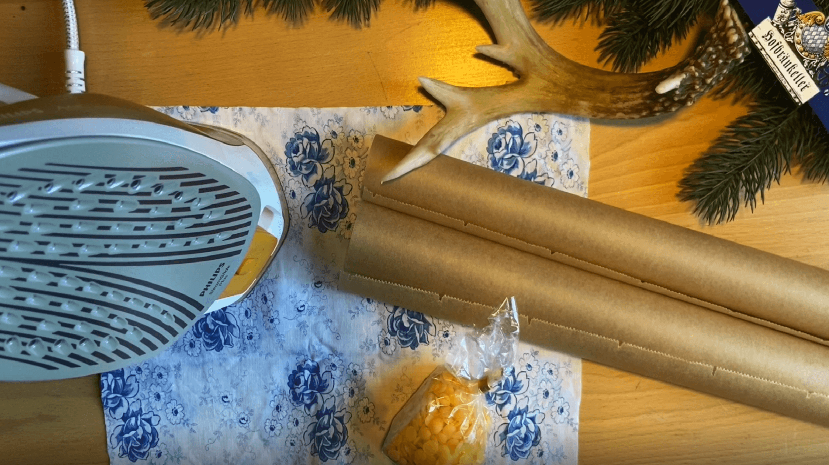 3. Das zweite Stück Backpapier auflegen und das Wachs mit dem Bügeleisen zum Schmelzen bringen, bis sich alle Plättchen verflüssigt haben.