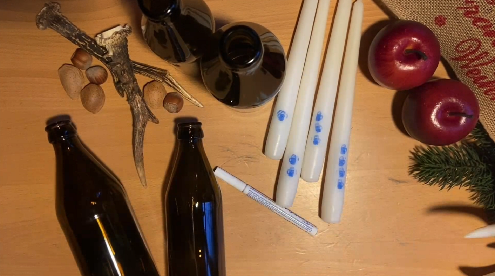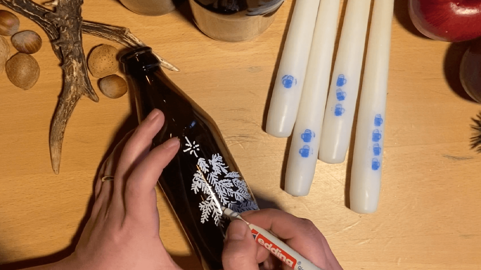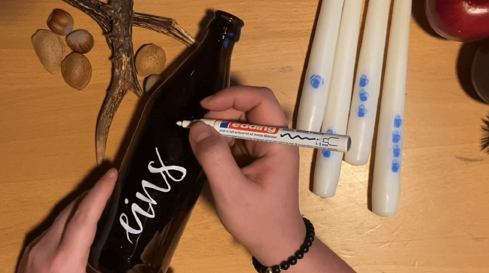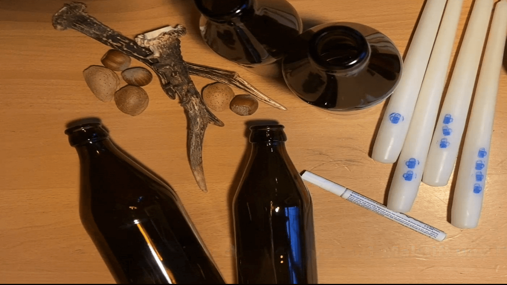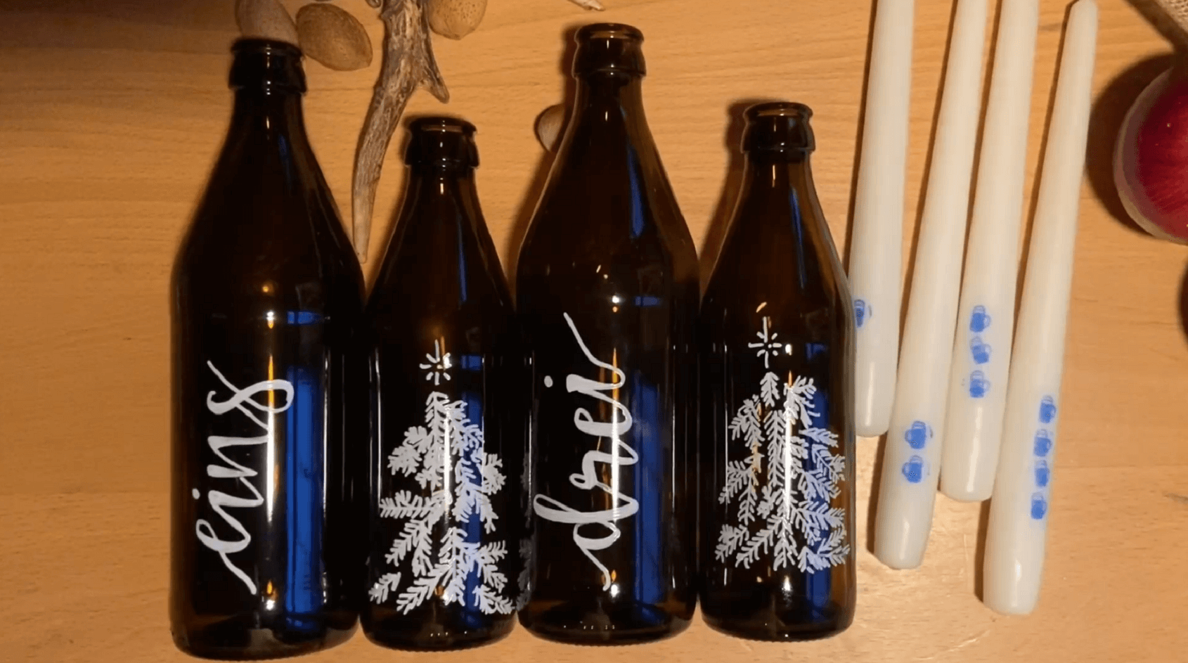 Aus 4 leeren Bierflaschen und selbstbedruckten Stempelkerzen zauberst du auf einfache Art einen schönen Adventskranz.