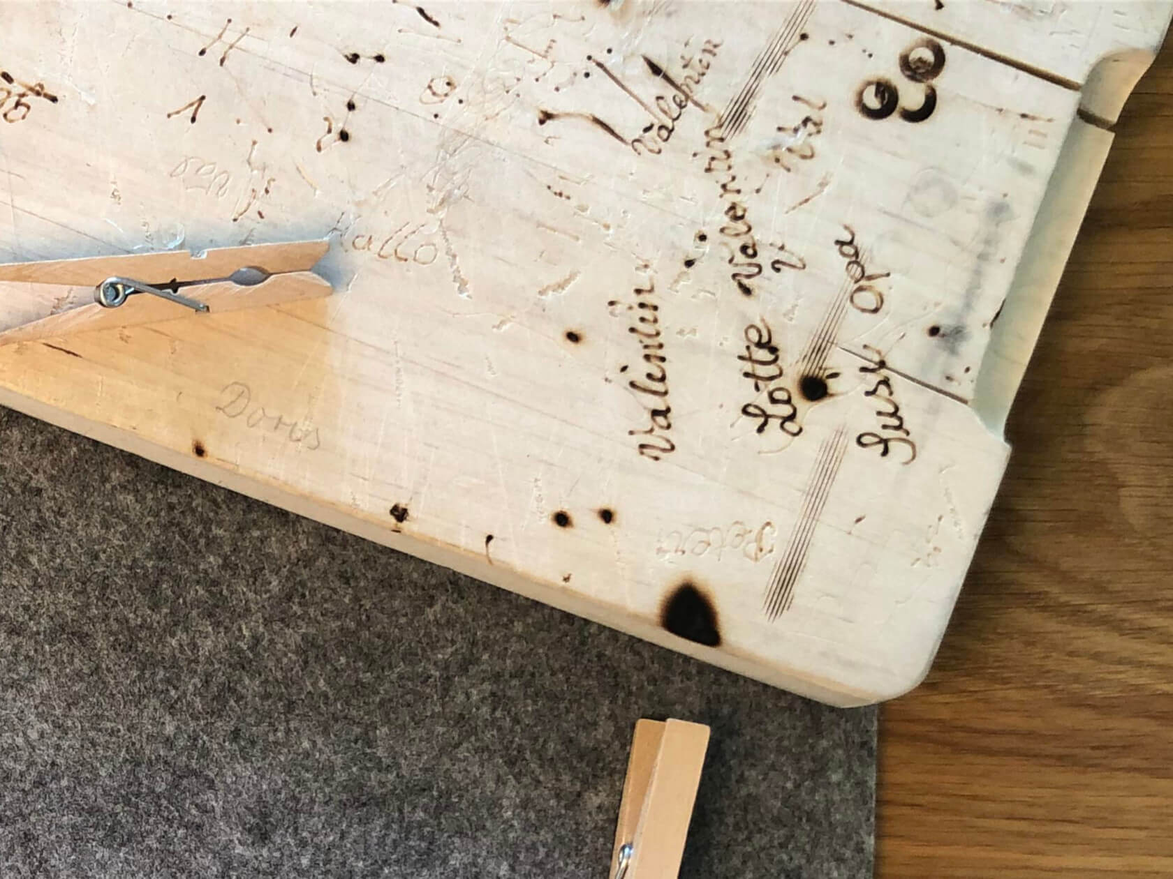 Versuche zunächst auf einem alten Holzbrett mit dem Lötkolben zu schreiben, um ein Gefühl für die Handhabung zu bekommen (je langsamer du die Linien nachfährst, desto intensiver wird das Motiv).